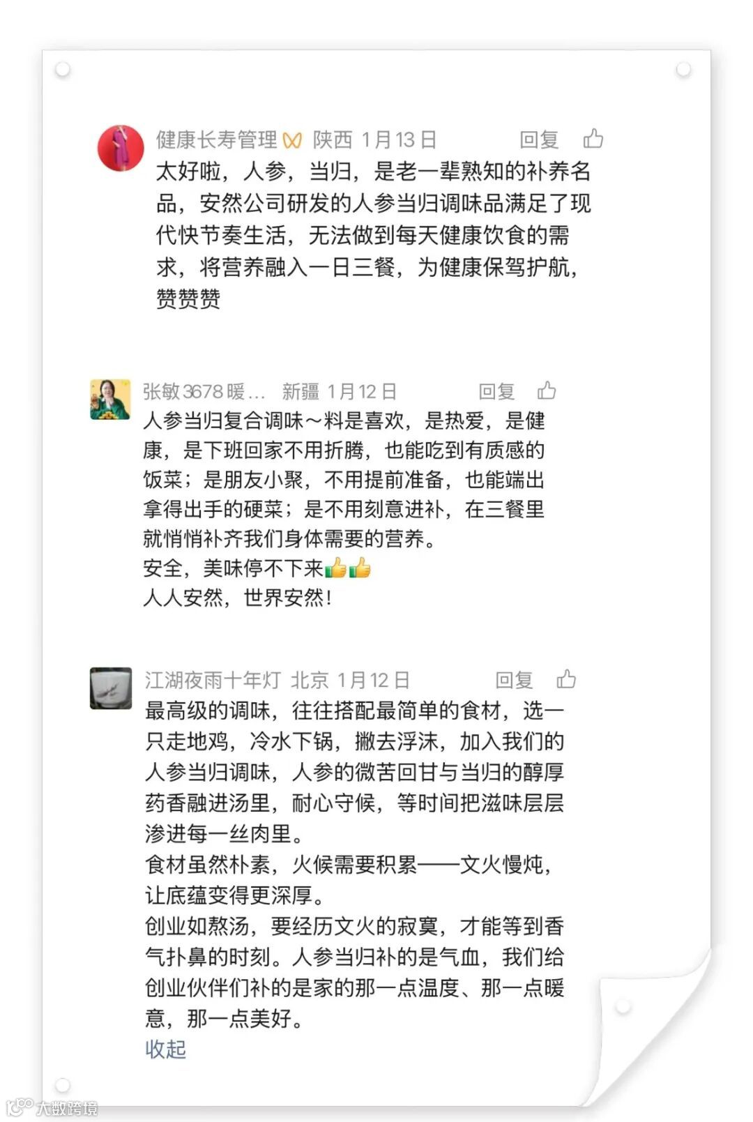 根据活动规则,我们从精选留言中,抽取了3位幸运儿,每人将获得人参当归复合调味料1盒!