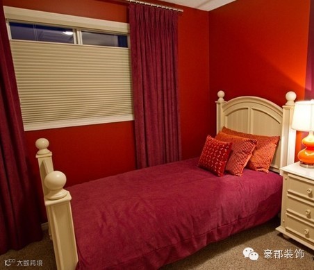 中国人认为红色是吉祥色,从古至今,新婚的喜房就都是满眼红彤彤的。红色还具有热情、奔放的含义,充满燃烧的力量。但居室内红色过多会让眼睛负担过重,产生头晕目眩的感觉,即使是新婚,也不能长时间让房间处于红色的主调下。选择红色在软装饰上使用,比如窗帘、床品,靠包等,而用淡淡的米色或清新的白色搭配,可以使人神清气爽,更能突出红色的喜庆气氛。