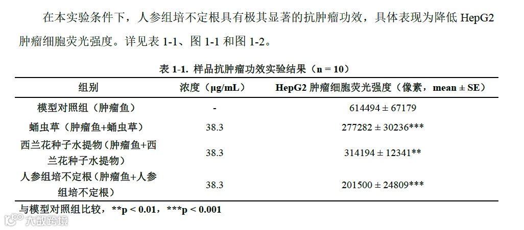 抗肿瘤功效测试中,人参组培不定根潜力突出。其抗肿瘤功效是蛹虫草的1.38倍,是西兰花种子水提物的1.56倍。