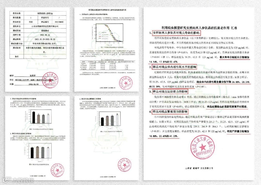 *以上结论源自哈尔滨工业大学《利用线虫模型研究安然纳米人参饮品的抗衰老作用》及《小鼠使用安然纳米人参饮品肿瘤变化情况对比》报告,报告编号为202106002(仅针对送检样品)