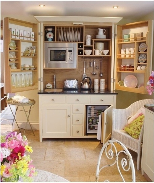 有的开发商造的小区的厨房面积偏小,设计师在这客观的条件下,无法施展设计功力,只能尽可能的将存储空间扩大。但是小厨房往往会给人凌乱不规整的感觉,收纳的地方太少,以至零碎的小东西摆的到处都是。所以如果厨房的每一处空间都能稍微利用起来,也许整个空间效果就不一样了。譬如在吊柜与地柜之间的墙上可以装一个叠架,微波炉或是电饭煲不用的时候就放置在其上;也可以安装一排挂钩或是收纳盘之类的,将散落的小物件都集中起来,减少它们占有的空间。
