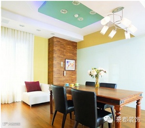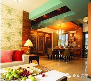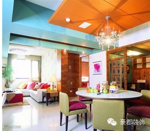 小编点评:从餐厅方位看客厅还是特别温馨舒适,餐厅的整体风格偏向东南亚,鲜艳的色彩以及餐桌椅的样式都带着点异域风情,其上方的吊灯很有华丽感,吊顶的设计也极为独特。
