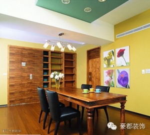 小编点评:墙面淡黄色,地板棕色,桌子棕色再加上黑色的椅子以及两色的墙面装饰画和绿色的吊顶,整个空间的色彩层次也极为丰富,很好的勾勒出舒适的氛围。