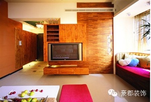 小编点评:电视背景墙的设计也极具创意,不同大小的木板爬上墙面,堆叠在一起,电视采用内嵌的样式,下方简易的电视柜很好的节省空间,上方的柜子中还细致的设计了几个搁架,也是很不错的收纳空间。