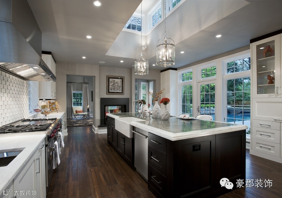 白色是简约主义的一种永恒颜色,简约厨房中运用白色,可以把看似狭小的空间以一种透视的效果达成纵伸感。同样黑色也是简约厨房的一个常用色,但黑色由于颜色过深,所以在厨房中很少会有大面积、整体的黑色,而是偏向于时下非常流行的黑胡桃木色为代表的深褐色,作为一种点缀色出现。