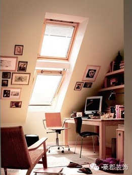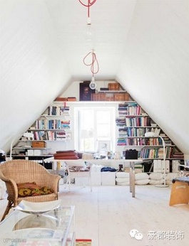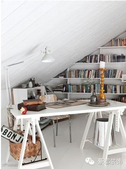 没有窗户的阁楼会让人觉得压抑,使用全套白色的家具和装修能改善空间的局限感,没有窗户时桌子就可以任意摆放,如果放在屋顶低矮的位置,就会有窝在角落工作的舒适安全感。