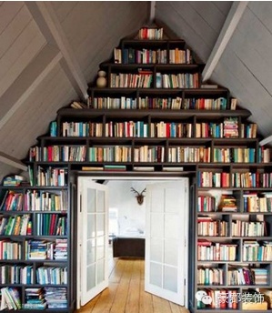 这样一整面墙的书架,家里的书再多也能放得下,但当你设计布局时也要考虑到,放在靠近屋顶位置的书不易拿取,最好放一些不太常用的书,或者干脆备个够高的梯子,爬上去找书的感觉有点儿像在古老书店里。