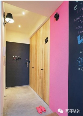 一个空间代表着一个人的性格,玄关即是转换心境和视觉不可或缺的设计,选择粉红色,转换每天回家的好心情,而地坪端则以水泥粉光做出与室内的区隔,保留了原始感,增添自然意象外,与粉红墙也形成强烈对比。