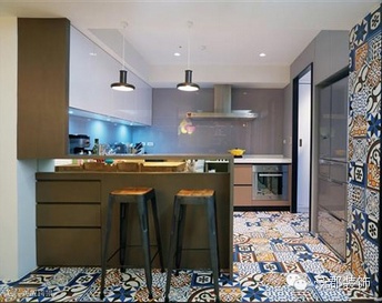 大胆采用花砖铺设,搭配简洁的白色及木色空间,再加上工业风的铁件吧台椅,三种完全不同的元素出现在同一个空间中,视觉冲突之中延伸惊喜,使原本平淡的空间马上就充满魅力。