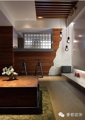 泥作石材与木材质混搭,在厨房与客厅中间做了一个吧台,再加上刻意用白色文化石不规则切割出线条,厨房则用空心玻璃砖搭成墙面,让光线自然透进屋内。