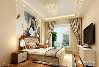 老人房一般上都要偏向于典雅庄重,而具有传统图案的装饰就是老人房墙面装饰的好助手,图中老人房床头背景墙就很典雅富贵。