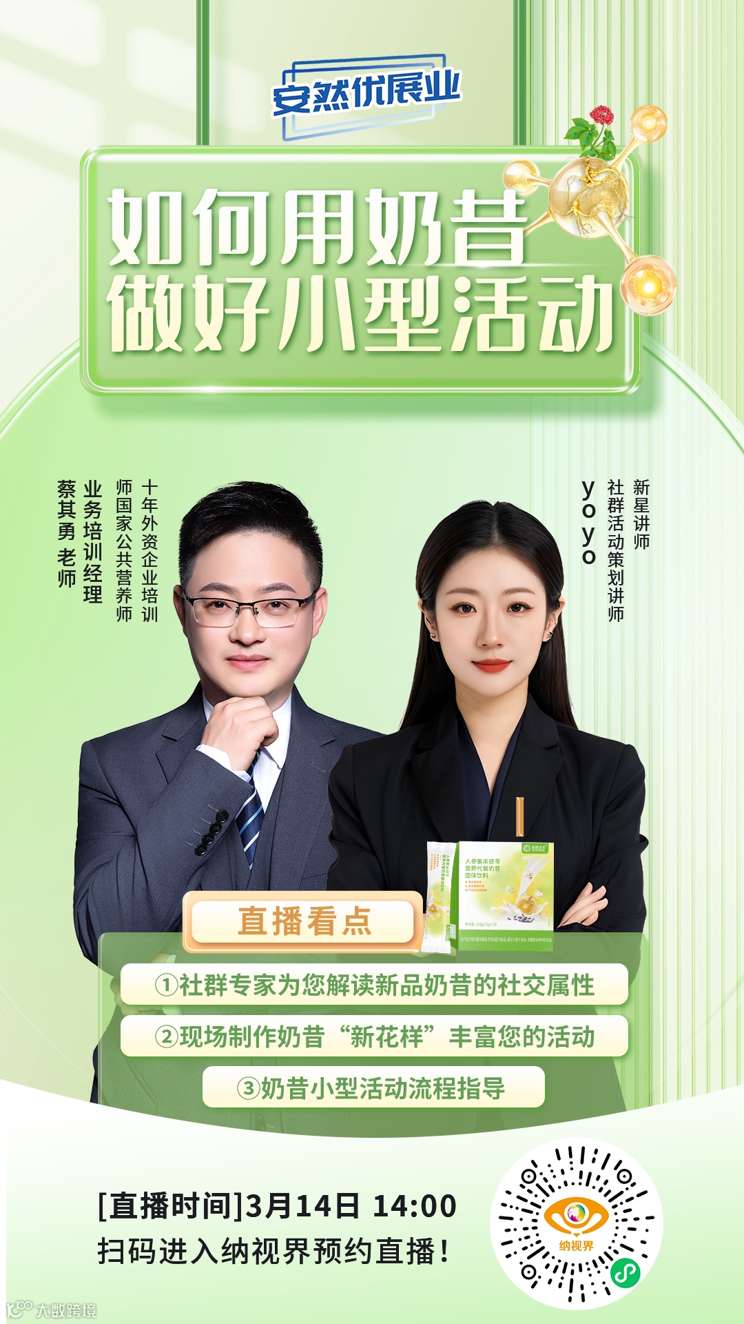 本期安然优展业直播,社群活动策划讲师yoyo老师,与特邀专家,安然业务培训经理蔡其勇老师,带来奶昔展业的全新思路!