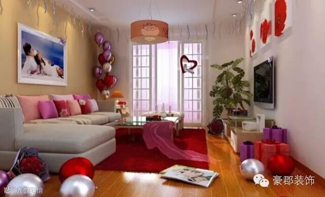 气球、玫瑰花和婚纱照成为婚房客厅装饰的主力军,看起来既喜庆又温馨。