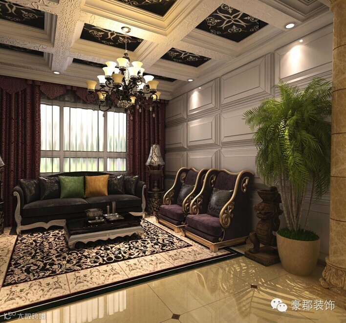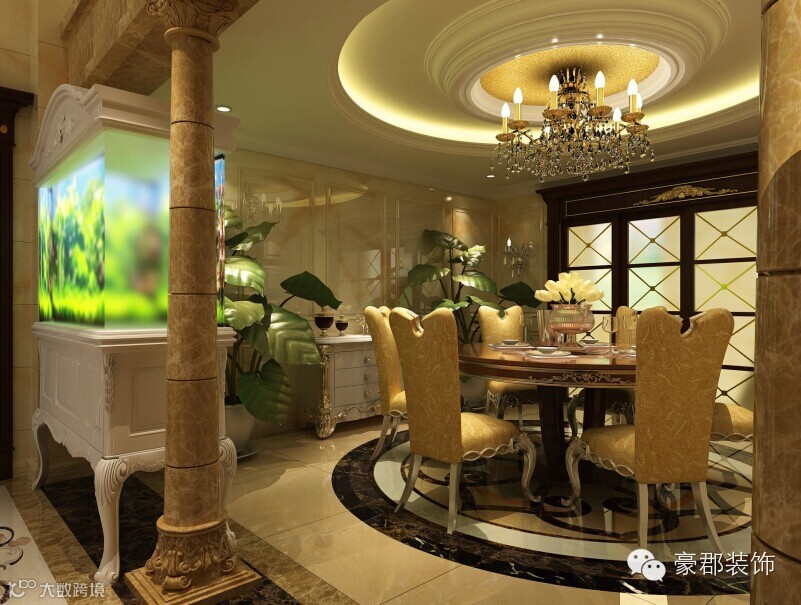 客厅典型的欧式石膏罗马柱,白色与黄色的合理搭配,在欧式风格的基础上加入了现代风格的元素,一方面保留了材质、色彩的大致风格,仍然可以很强烈地感受传统的历史痕迹与浑厚的文化底蕴,同时又摒弃了过于复杂的肌理和装饰,简化了线条。在简约的基层上而不失华丽高贵,尽显贵族风。在配饰上,选择的是欧式水晶的装饰吊灯,白色透明鱼缸、绿色植物更是为空间增加了无限的自然气息。