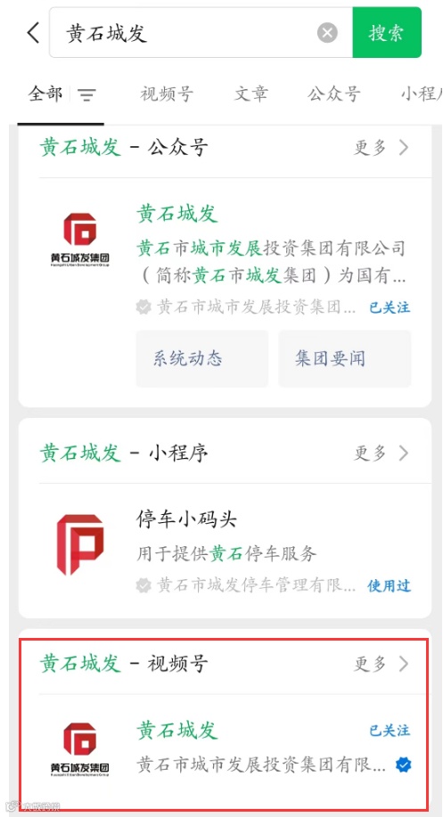 1、打开微信,搜索并关注“黄石城发”公众号,进入“黄石城发”微信公众号主页,即可看到关联的视频号链接,点击链接即可关注。