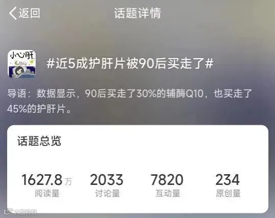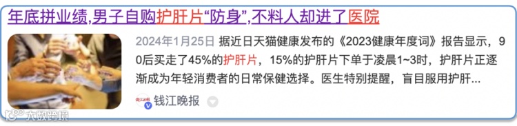 近日,一则#近5成护肝片被90后买走了#话题在微博上热闹非凡,据天猫健康发布的《2023健康年度词》数据显示,90后买走了45%的护肝片。
