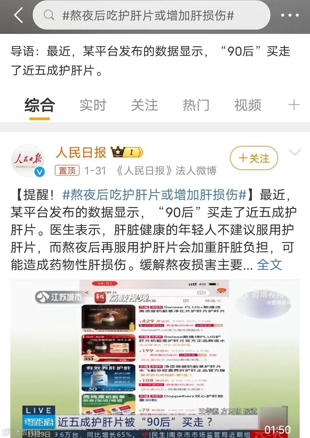 随后,#熬夜后吃护肝片或增加肝损伤#话题冲上热搜,医生表示,“熬夜后再服用护肝片会加重肝脏损伤,可能造成药物性肝损伤”。
