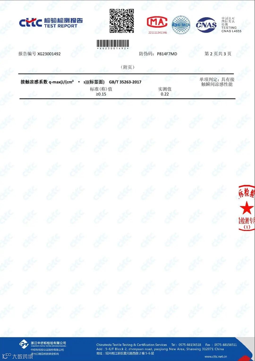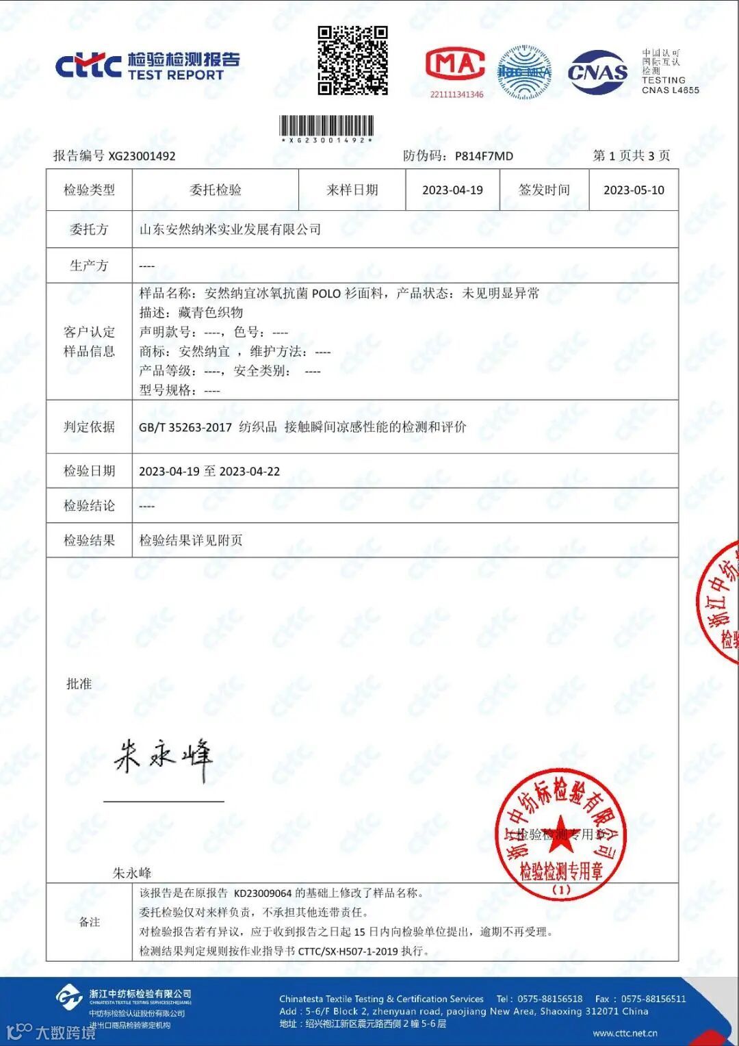 检测报告显示,冰氧抗菌polo衫的凉感系数达到0.22,具有接触瞬间凉感性能。