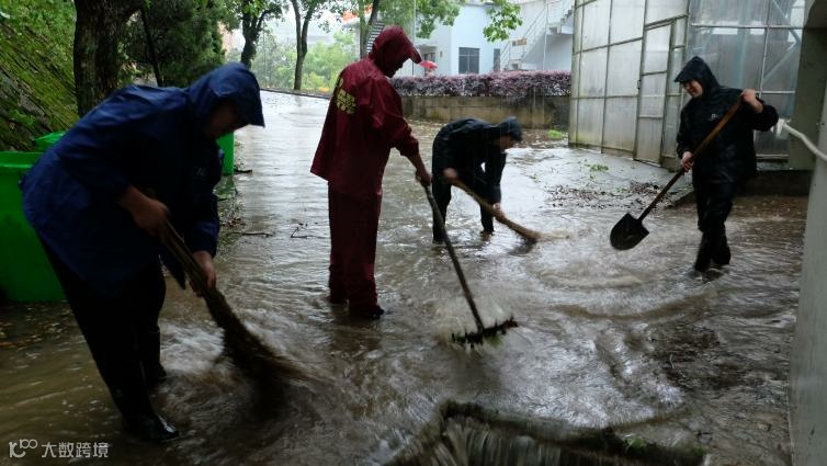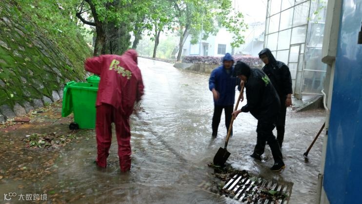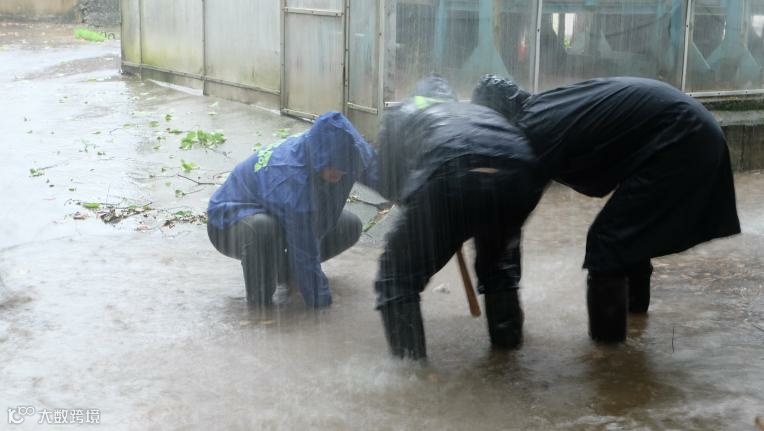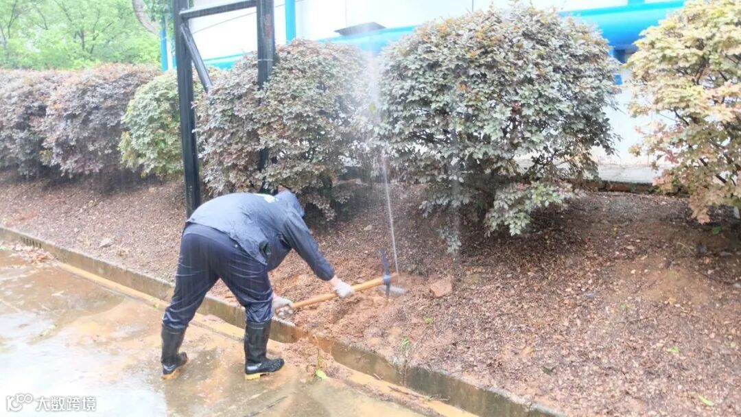 青山湖厂职工雨中疏通提升泵房外下水管道,保障电缆沟安全