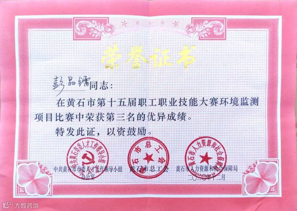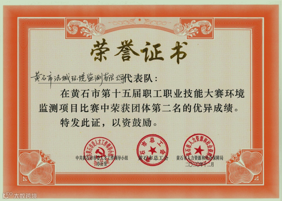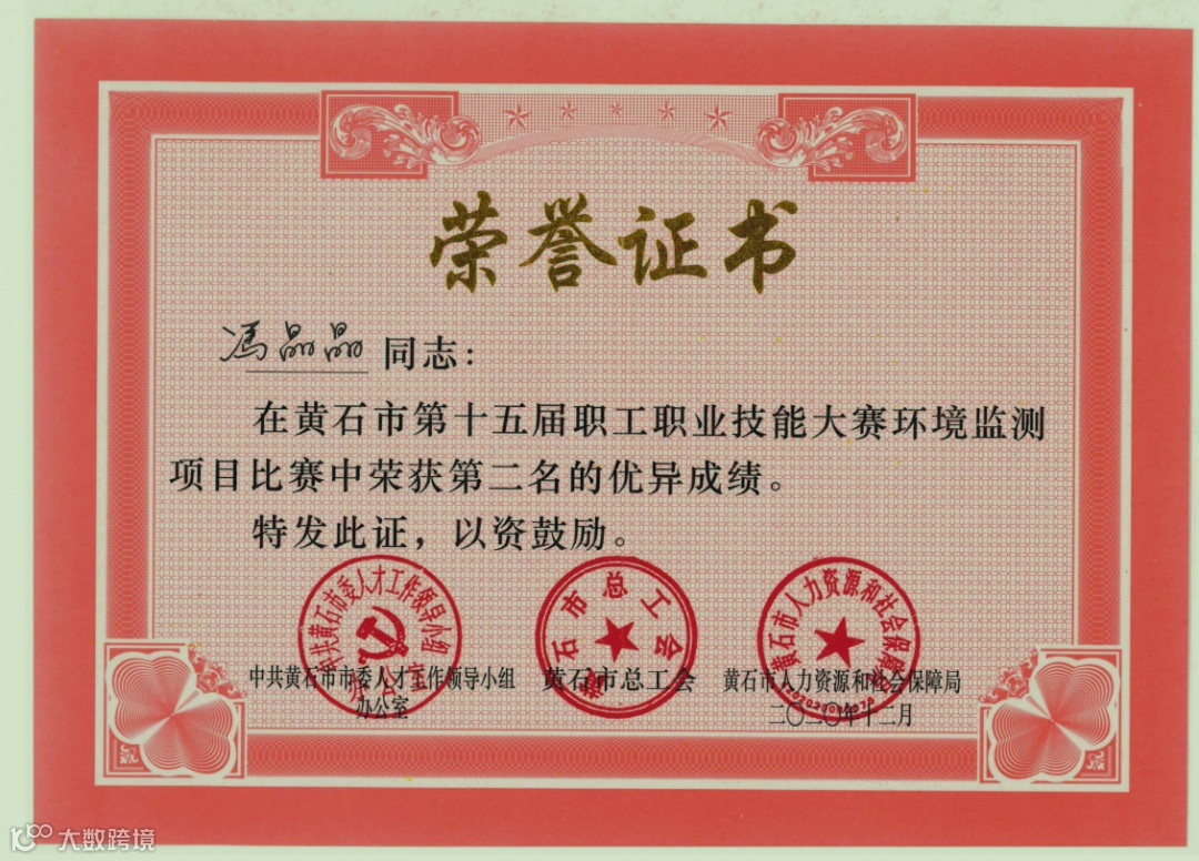 2020年12月24日上午,由黄石市总工会主办的黄石市第十五届职工职业技能大赛颁奖仪式在大冶职校举行。城发检测公司洁城实验室获得环境监测项目团体第二名,城发检测公司职工冯晶晶、彭晶镭分别获得环境监测项目个人第二和三名的优良成绩。