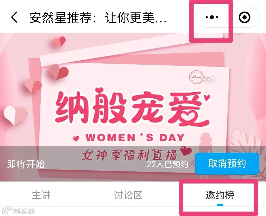 直播间已经正式开放,您可以进入纳视界点击直播间右上角将直播间分享到微信、朋友圈或群聊中,邀约伙伴进入直播间。我们设置了“邀约榜”,截止到直播结束,邀请榜TOP3的家人会得到惊喜礼物慕瑟玑因焕肤面膜1盒(邀请人数需大于20人)