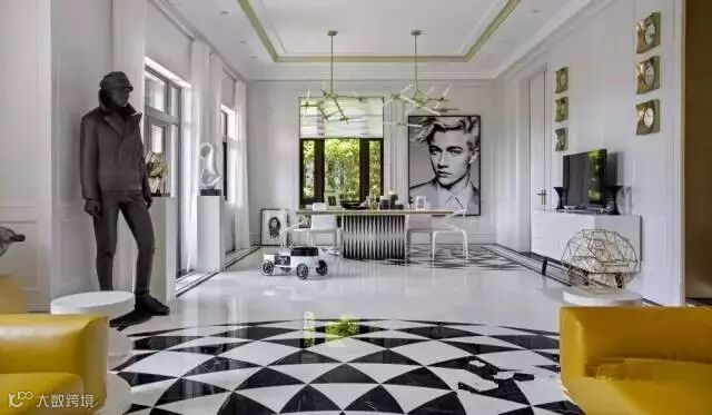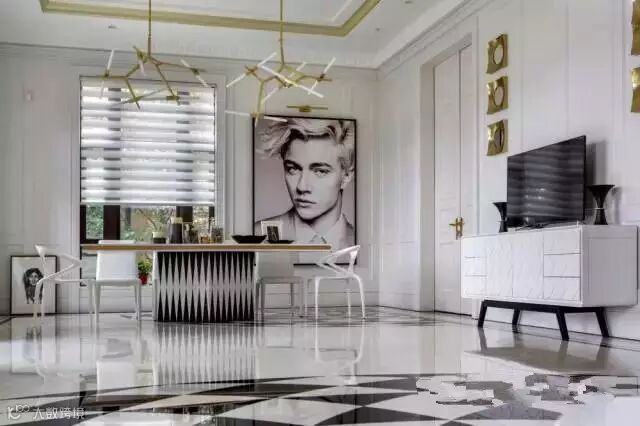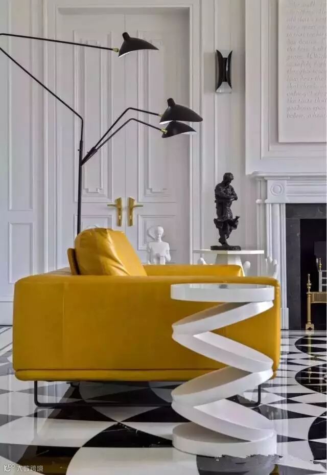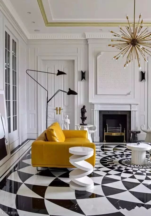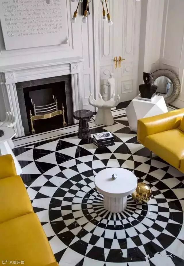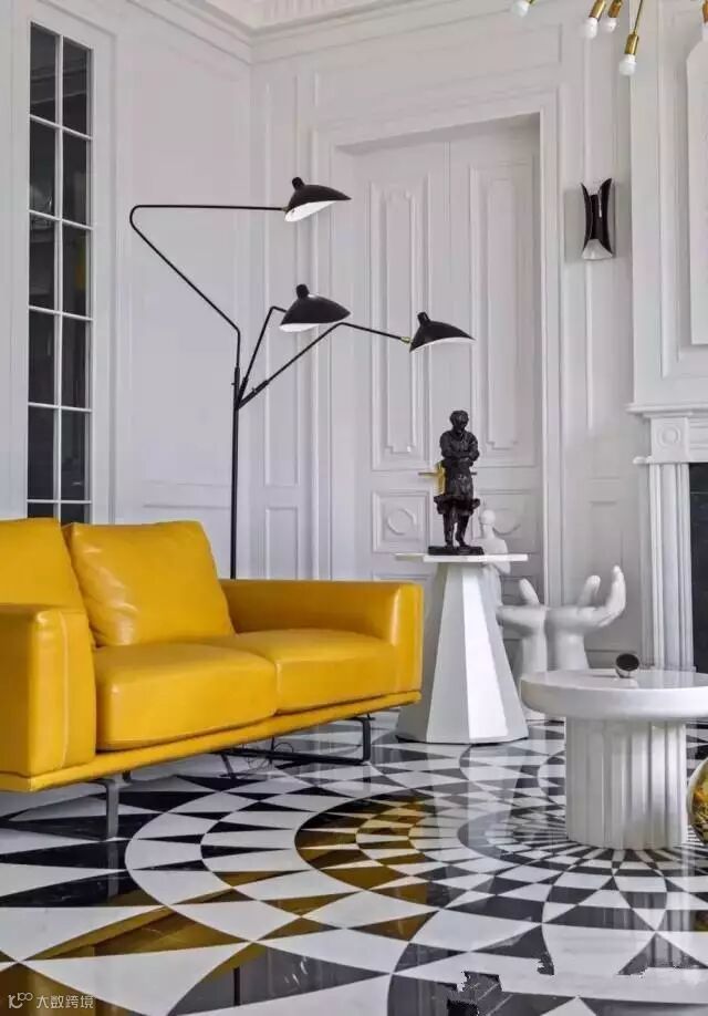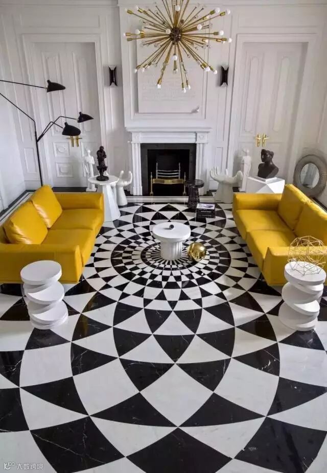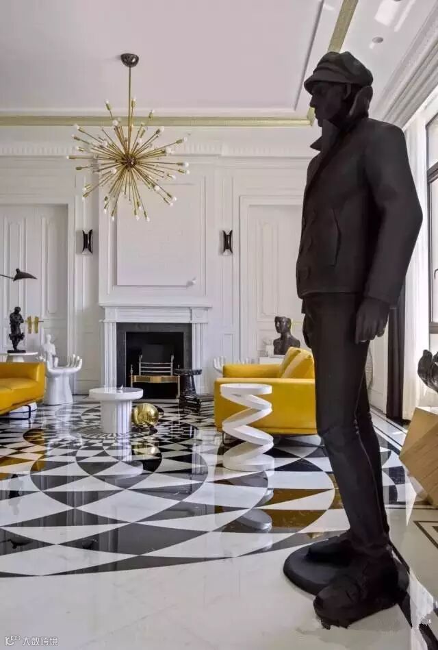 客厅时尚而前卫,量身定制的圆弧形大理拼花形成了独特的视觉感受,简明的黑白两色的运用,又在回转间有了线面的对比,让人真正体会到他在艺术中捕捉视觉之美的能力。