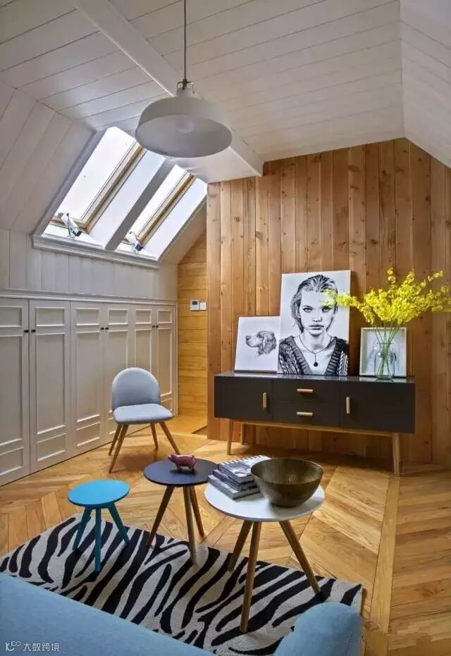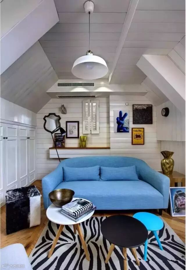 阁楼是预留的一间小客厅兼储藏室。自制的鱼骨地板搭配着柔软舒适的地毯,各式各样的装饰画和鲜艳的沙发,压力再大的人都不会再有烦恼。