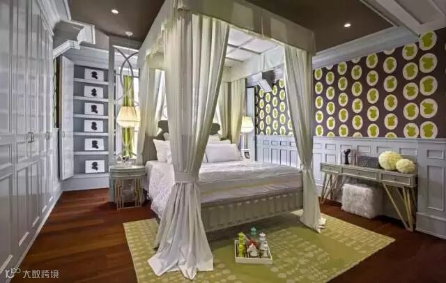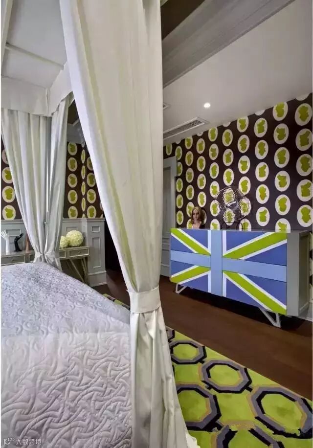 卧室以透空的木质隔断区分出不同空间区域。靠窗部分的休闲区,让人在闲暇之余可以静坐在此浏览湖边的风景,微风拂面是如此的惬意。而隔断的另一端摆放着他设计的高柱床,整个都有米白色的床幔包裹,各式的配画搭配着柠檬绿绒布的英国女王像壁纸,带着令人遐想的意境。在墙面上众多的收纳柜中还暗藏一个楼梯,巧妙地连接卧室与阁楼两个不同功能的空间。
