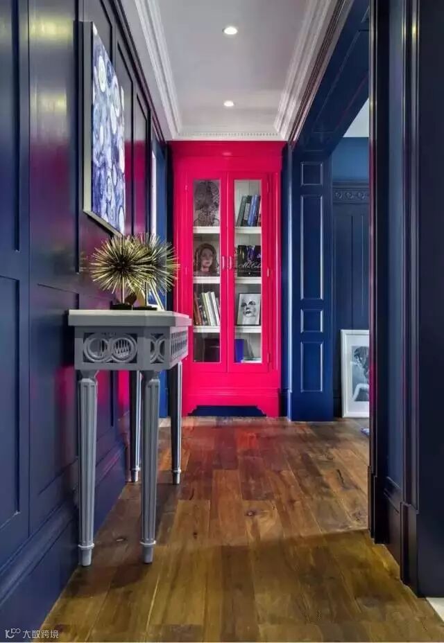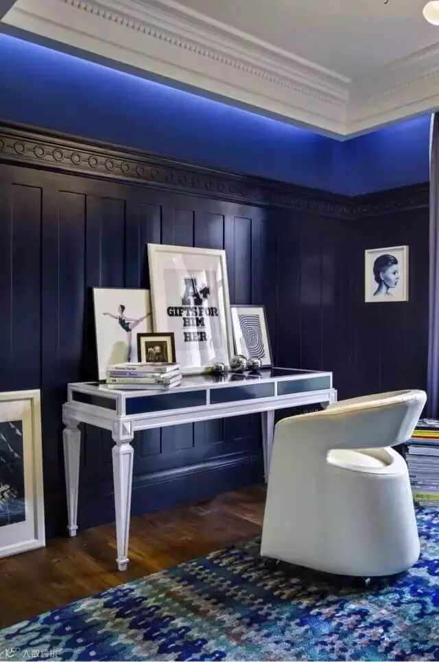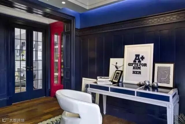 西边的套间书房大面积的藏蓝色饰面冲击着玫红色的壁柜,这样的对比效果让人兴奋,整个书房没有过多的装饰,看上去非常的安静,当你坐在白色的沙发,喝上一杯咖啡,看看窗外的景致,让人产生无限的遐想。