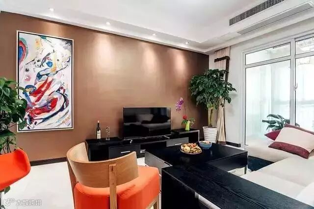 大面积的深色背景墙搭配抽象的画作