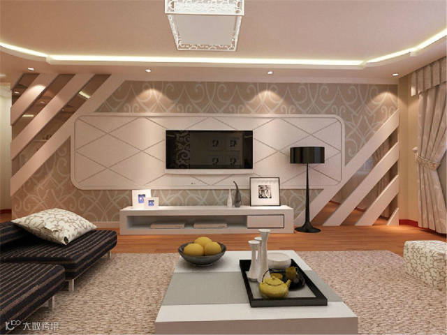 影视墙采用暗色壁纸与石膏板造型和结合