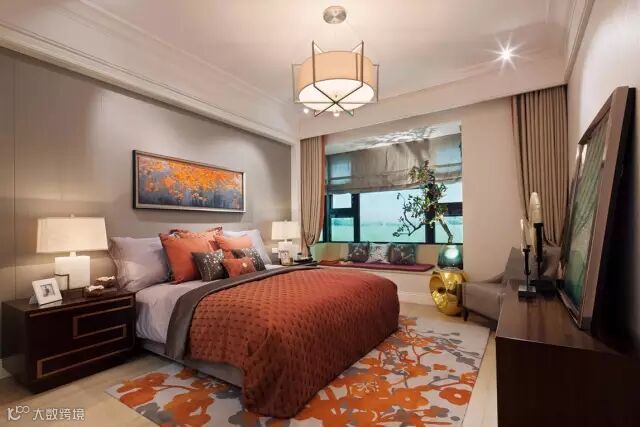 主卧室暖色的地毯搭配同色系的床品结合画
