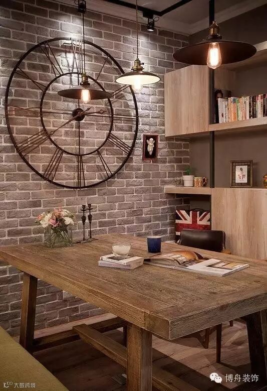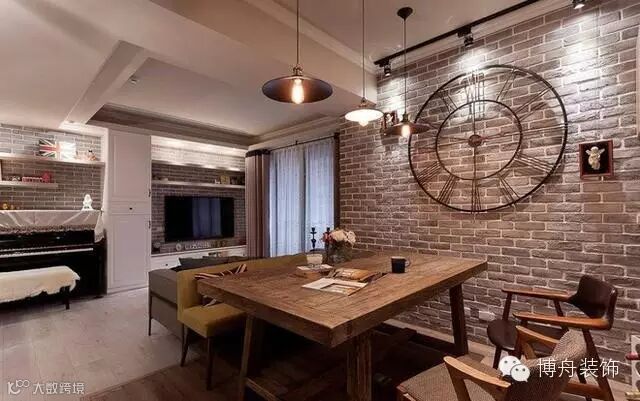 主要色调定为暖色调的褐色与木色,烘托出一种舒适的气氛。裸露砖墙的设计从20世纪末开始成为流行,因为大家发现这种暴露的砖墙常常给人与众不同的感觉,并且打理起来也没有那么费心费力。比如本案中裸露的灰褐色砖墙设计就给人一种时尚却又不失淳朴之感。
