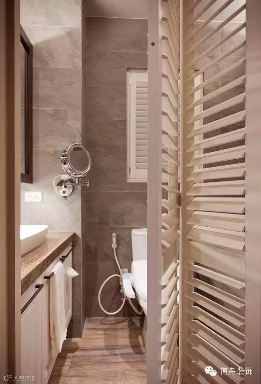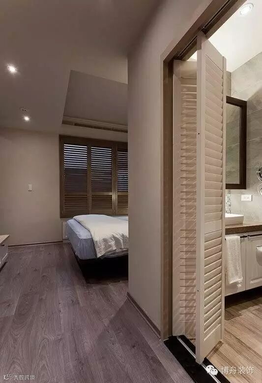 百叶窗与卫浴间的拉门,打造出欧式旅馆般的氛围。