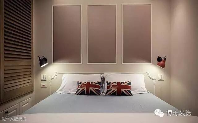 米色旗抱枕呼应空间主题,裸色与灰褐色的结合非常适合卧室,床头两边一黑一红的壁灯设计感也很强,非常摩登。