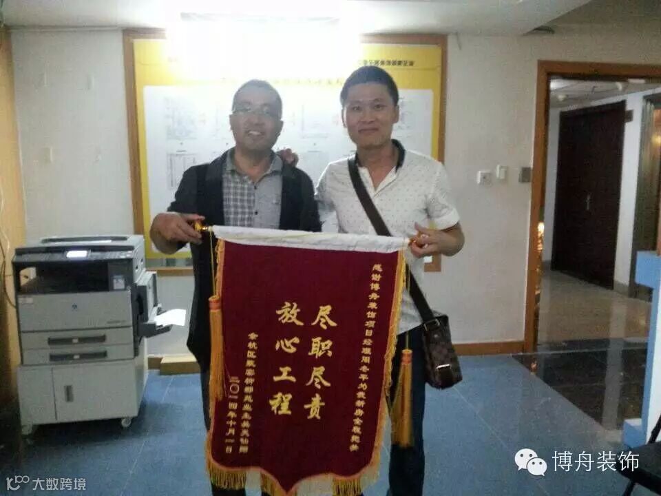 业主吴先生将锦旗交到我们手中的同时,他也表示道:“真的非常感谢博舟,不遗余力的将工程做到最好,在装修过程中,我也是亲眼见到了你们的施工,你们称得上是放心工程,有了放心工程,我们业主自然就能体验到装修所带来的快乐。我平时也很忙,但这一次我一定要亲手将锦旗送到你们手中。”
