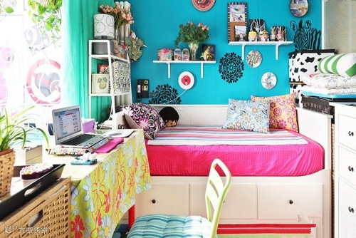 收纳TIPS:在床上摆放一个收纳架,把常用的物品放置在上面,十分方便。简约的线条搭配多彩的床品,瞬间变得实用而又独特,有着小清新的活力。