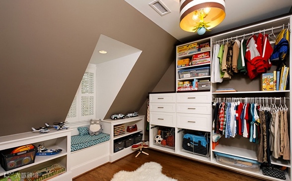收纳TIPS:在这个看似“凌乱”,非常随性的卧室里,墙壁上的船桨用来装饰之余,也被用作收纳架,收纳小孩的衣物,迎合主题之余还注重了实用意义,甚是活泼、个性十足。
