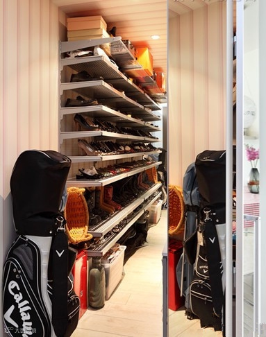 收纳TIPS:入门玄关处,选用有延伸空间效果的白色组合玄关柜,组合式玄关柜占用面积不大,却具有强大的收纳功能。不仅柜里面可以储放物品,连玄关台面也能放置钥匙等日常用的小饰品,而下方镂空地方,也可以摆放日常所穿的鞋子。
