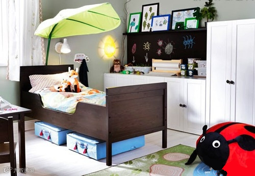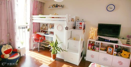 收纳TIPS:这个儿童房借助玩偶和卡通布艺等营造出了一个非常可爱的童话世界,而小孩子的玩具、衣物也要注意收纳,床底的两个大大的蓝色收纳箱,则可以有效的解决这个问题,色调柔和,和整个卧室非常协调。
