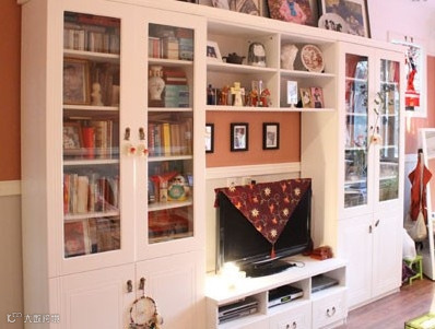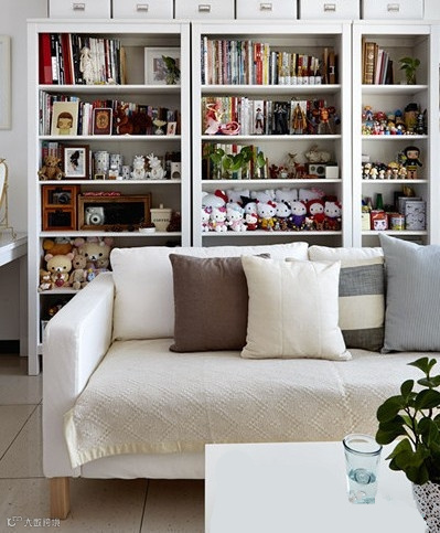 收纳TIPS:白色的家具能有效弥补小户型在空间上的紧张局促感,有效地延展了视觉范围;沙发后面是主人收藏品的展示柜,起到了很好的收纳功效,展示柜中密密麻麻摆放了各种玩偶和书籍,多却不显凌乱。
