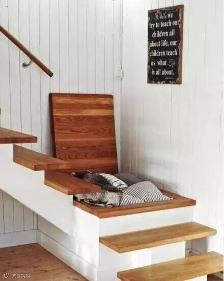 收纳TIPS:卧室的另一端,除了矮柜的收纳外,旁边的白色梯子非常的亮眼。这款梯子可以方便上下拿取物品外,大小不一的抽屉还可以收纳各种物品。