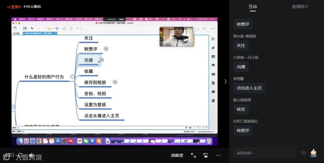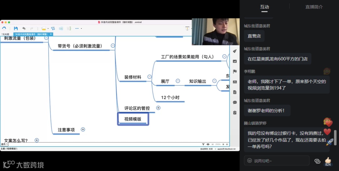 讲师通过思维导图的形式,用通俗易懂的语言向大家介绍直播带货的底层逻辑、如何运营抖音账号等知识。不少学员边学边实践,并纷纷在互动区留言,表示受益匪浅,日后会观看回放再研究学习。