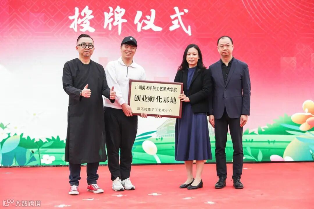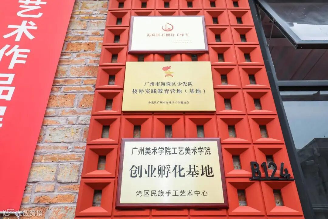 仪式上,海珠区委统战部、共青团海珠区委员会、广州美院分别授予湾区民艺中心“海珠区少先队校外实践教育营地(基地)、海珠区石榴籽工作室、广州美术学院工艺美术学院创业孵化基地牌匾。