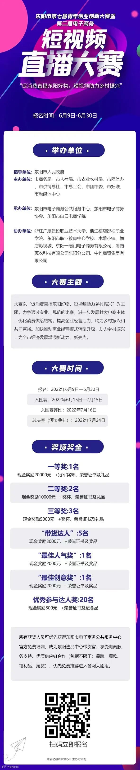 为了进一步贯彻落实市委、市政府关于发展电子商务产业的工作部署,深入推进我市电子商务进农村综合示范工作,大力发展短视频直播电商新业态,推动电商新模式及“网红经济”的健康发展,挖掘和培养本地短视频直播达人,更好地宣传东阳、推介东阳,提升东阳知名度、美誉度和影响力,特举办东阳市第七届青年创业创新大赛暨第二届电子商务短视频·直播大赛。