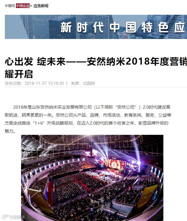 2018年11月27日,中国网专题报道“心出发 绽未来——安然纳米2018年度营销表彰盛典荣耀开启”。