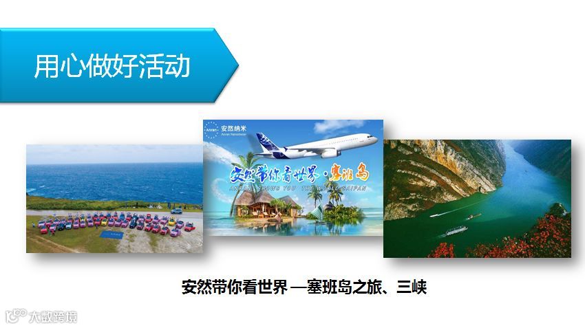 ●安然带你看世界,我们组织了塞班岛游和长江三峡游,全新升级的旅游活动,让安然家人一览世界的美丽风光,尊享荣耀和富足。