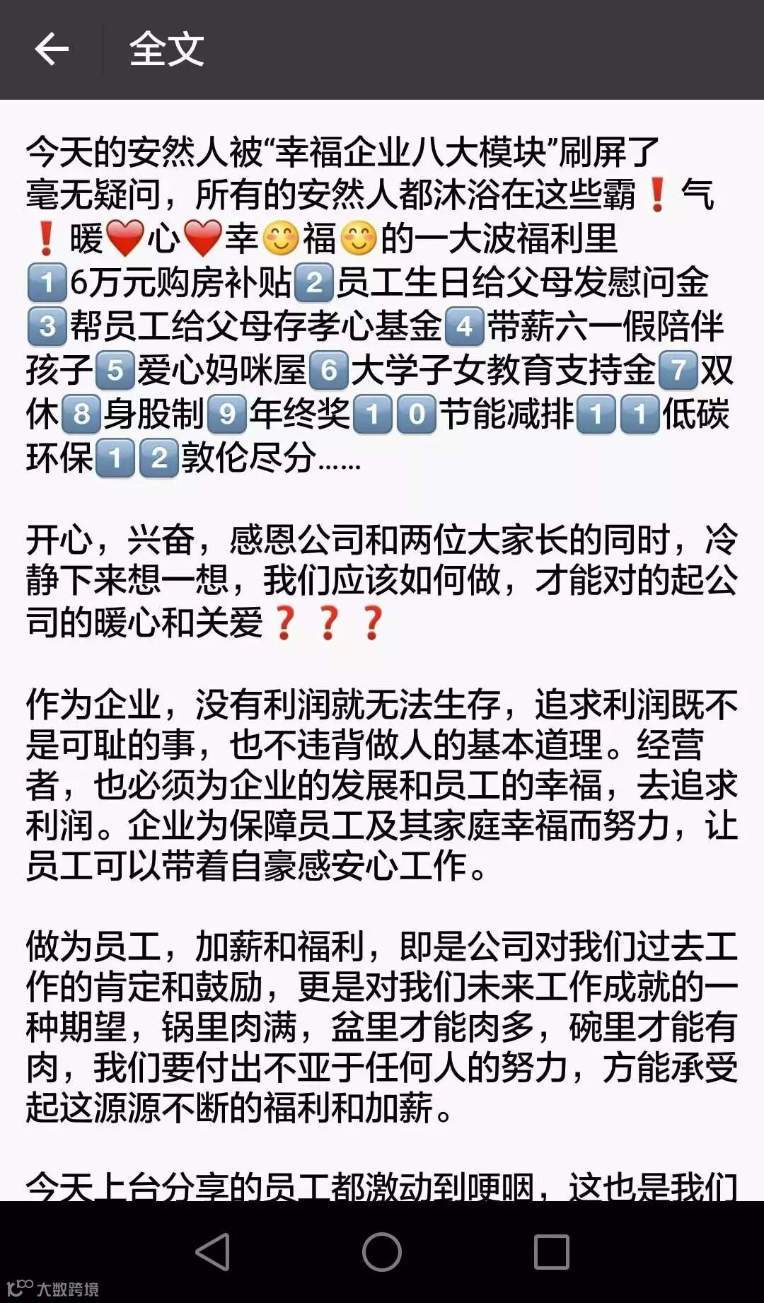 此次幸福八大模块发布会,不仅惠及员工的经济和待遇,在员工素质教育、社会绿色环保、慈善等方面都发布了幸福政策,倡导继续教育、低碳出行、社会关爱等,真正体现出一个大企业的本色与风范。