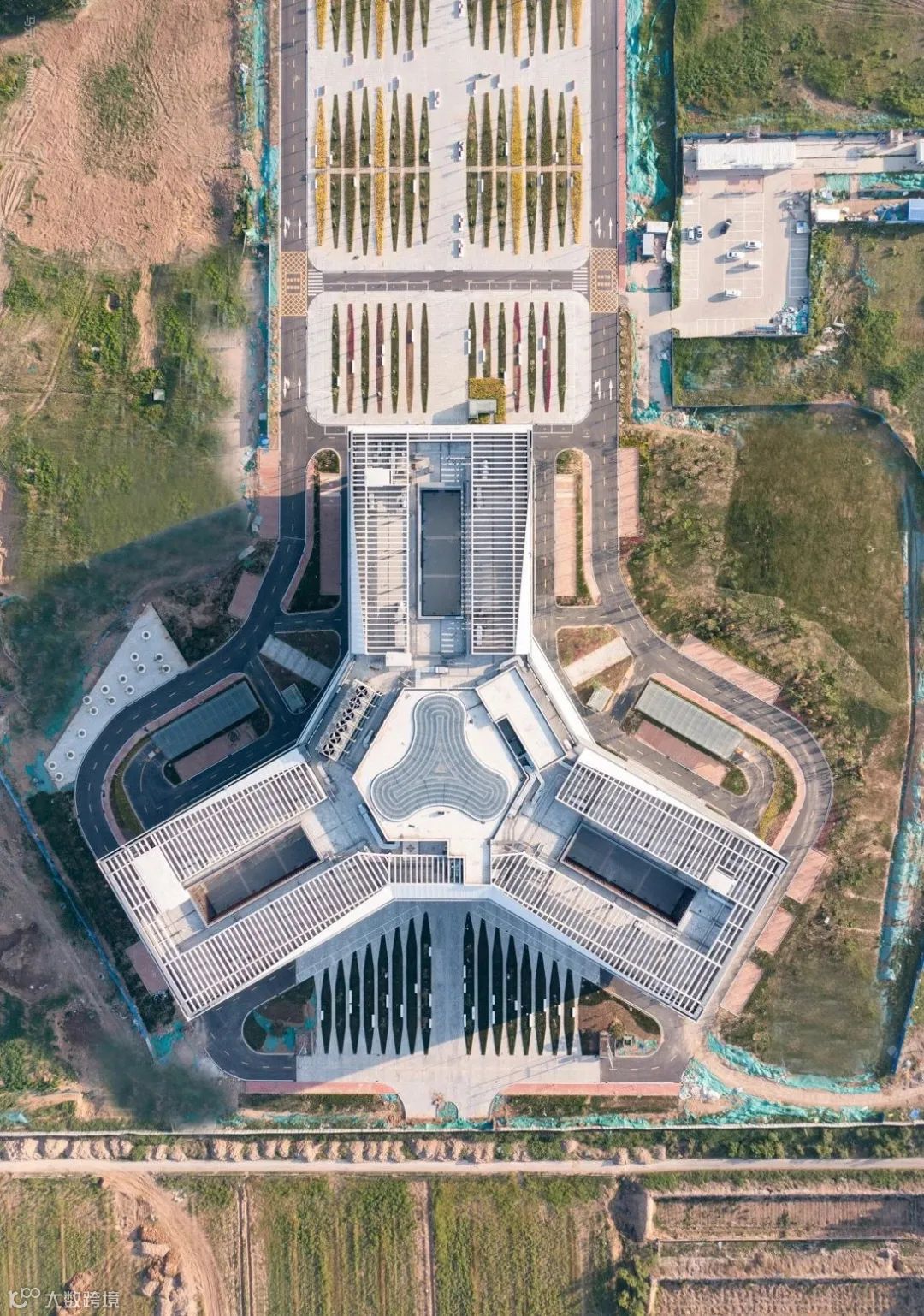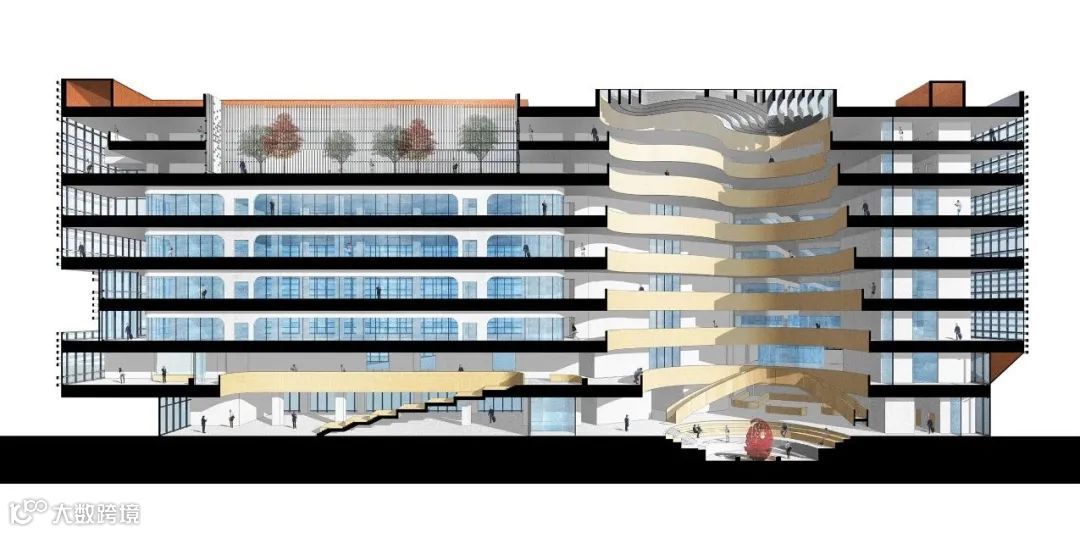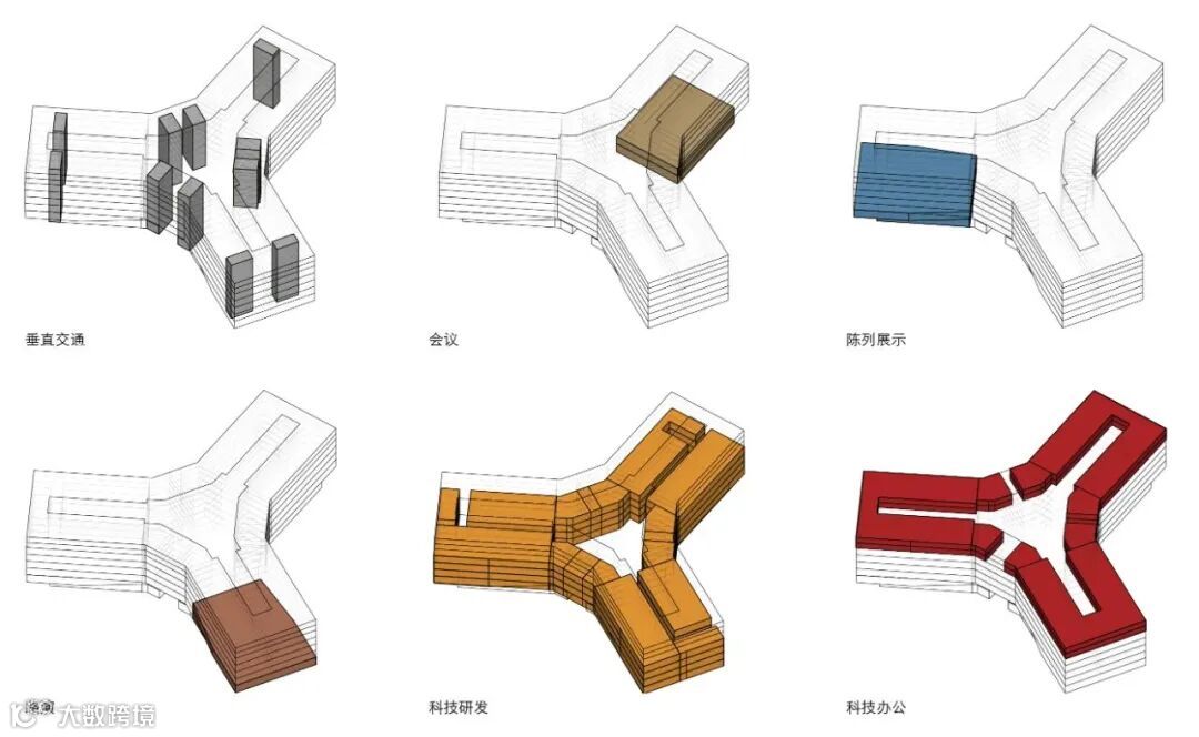 综合楼采用完整的风车状几何形体,建筑因借其功能复合性,形成丰富的空间形态。