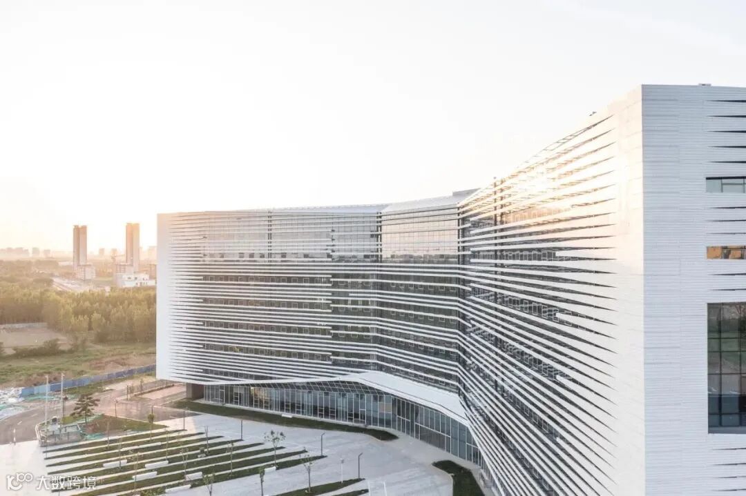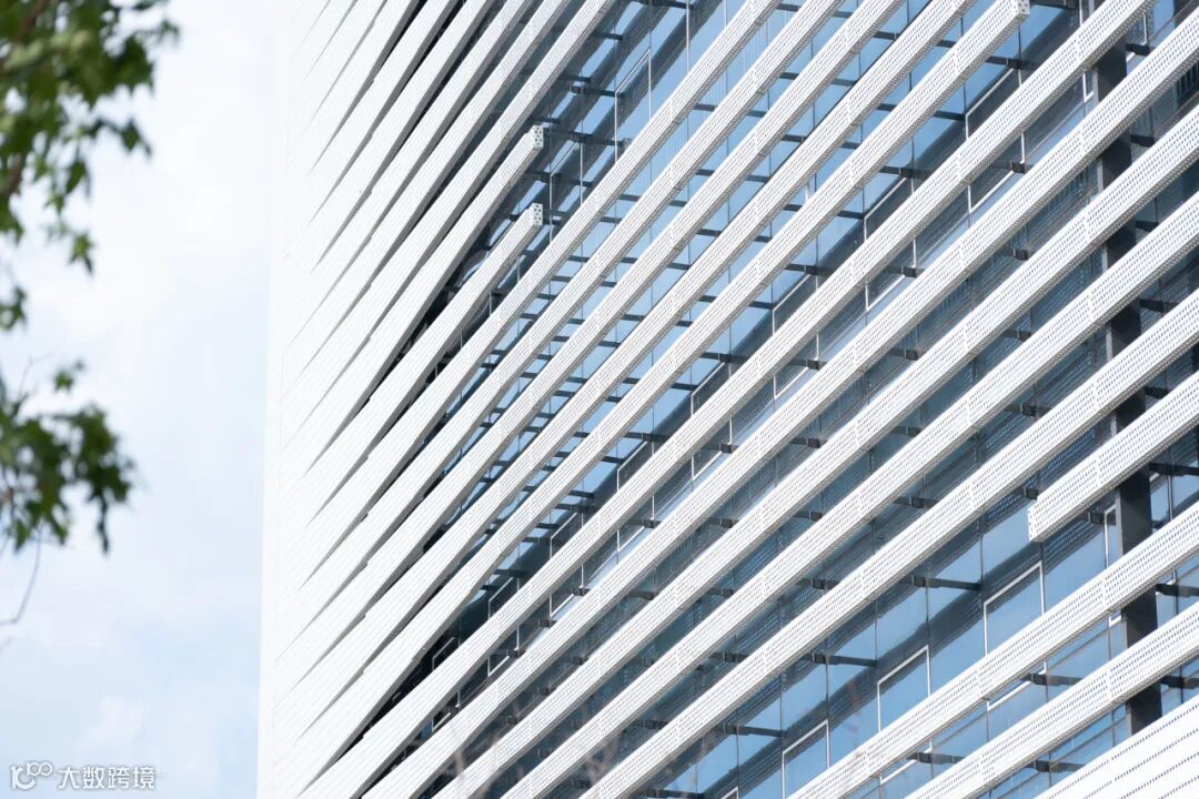 立面设计延续纽带概念,内层幕墙为全玻璃幕墙。外层幕墙为横向穿孔铝板百叶,外形大气现代、富有科技感。解决玻璃幕墙的遮阳问题的同时在人视点高度位置做变化处理。